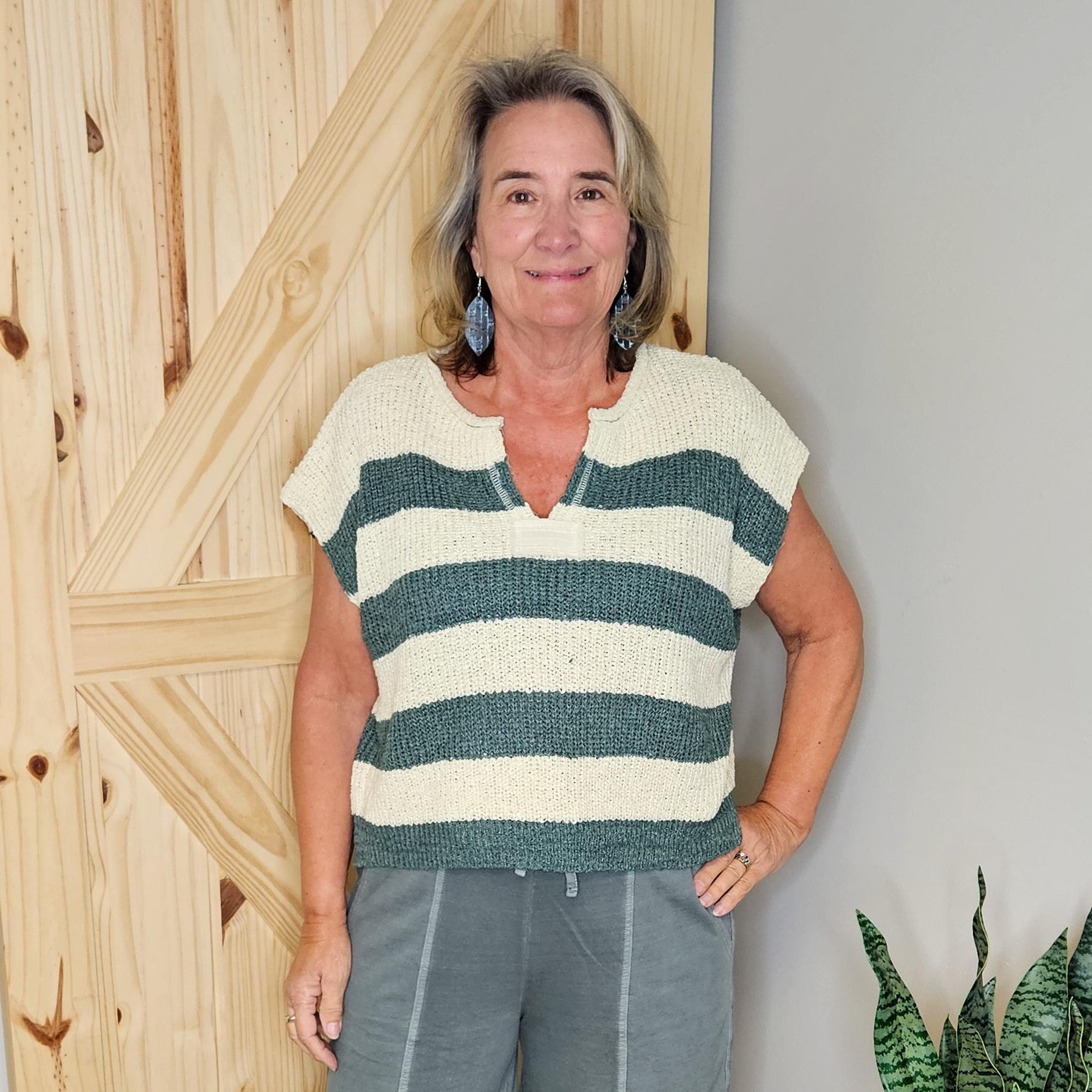 Split neck striped sleeveless sweater.